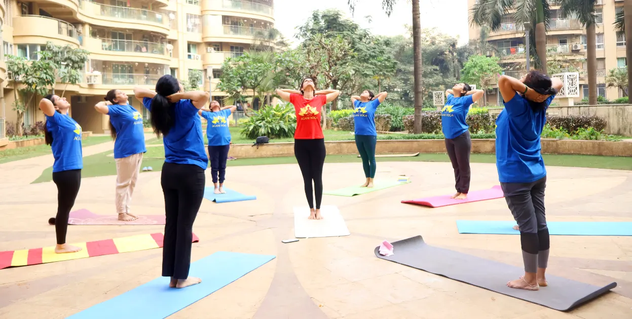 - For better stretch and energization, move the hands in, and interlocking your palms, hold the hands tight, pushing up your abdomen and the chest